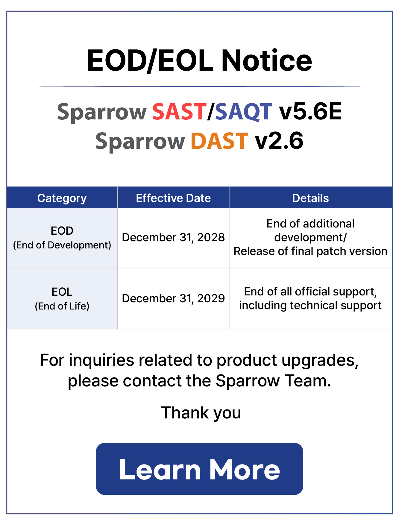 Sparrow SAST/SAQT v5.6E and Sparrow DAST v2.6 Product EOD/EOL Notice